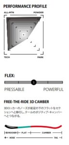 パウダーから圧雪バーンのカービング、地形で遊んだり、キッカーを飛んだり、ボックスでこすったりと、オールマウンテンをこれ一本で済ますならコスパのいい板です。